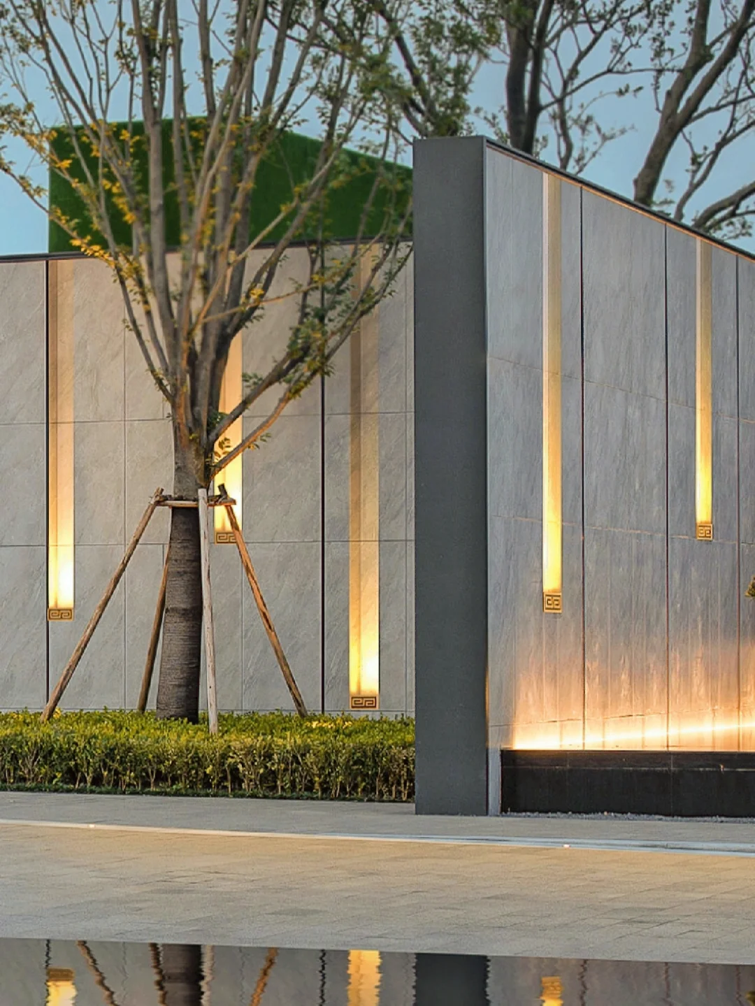 涼亭或景墻等建筑景觀可以用投光燈強調其立體感,達到用影繪畫的效果。對柱子或景墻做裝飾性照明,具有導向性,限定夜間活動空間。涼亭等休息區域做氛圍照明,提供舒適柔和的燈光環境。
