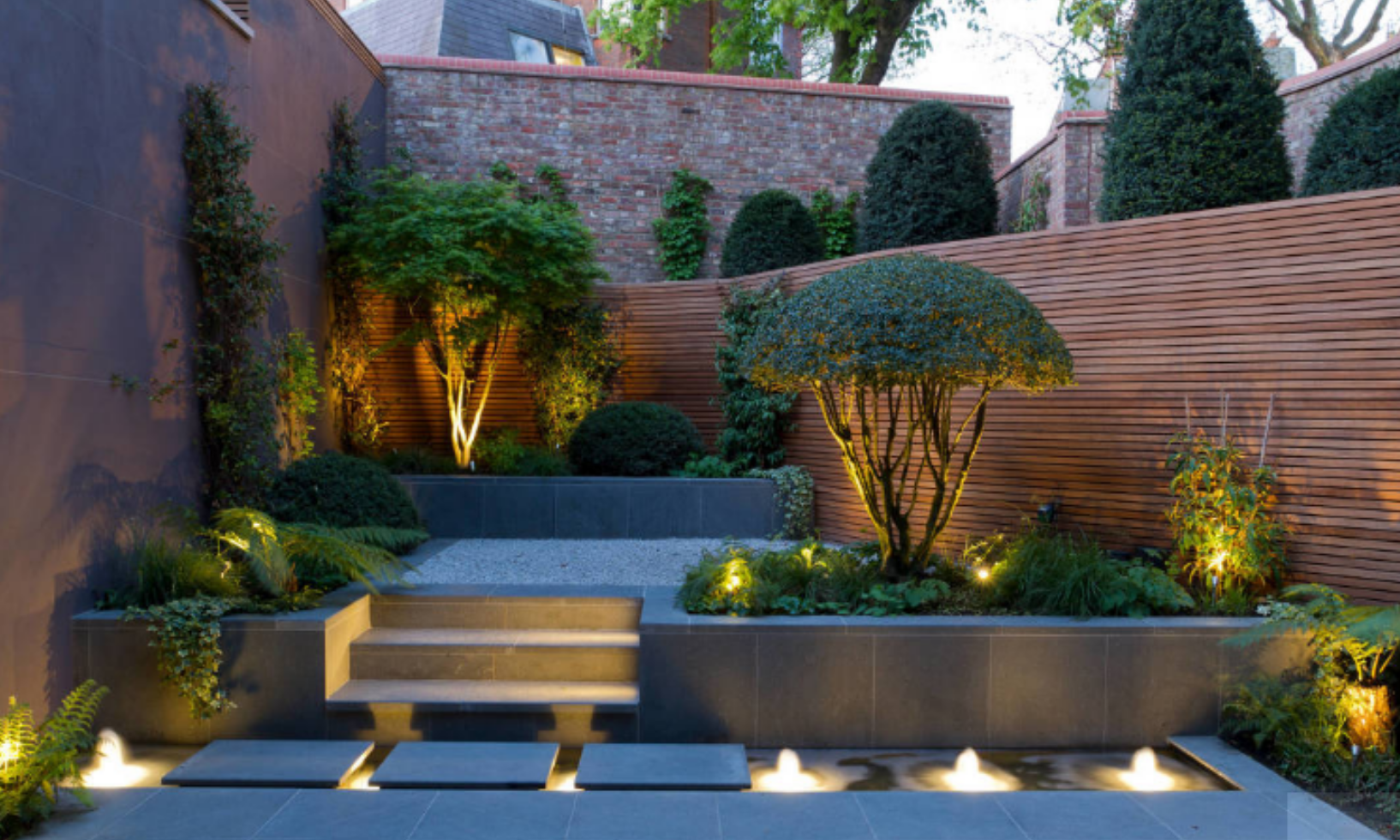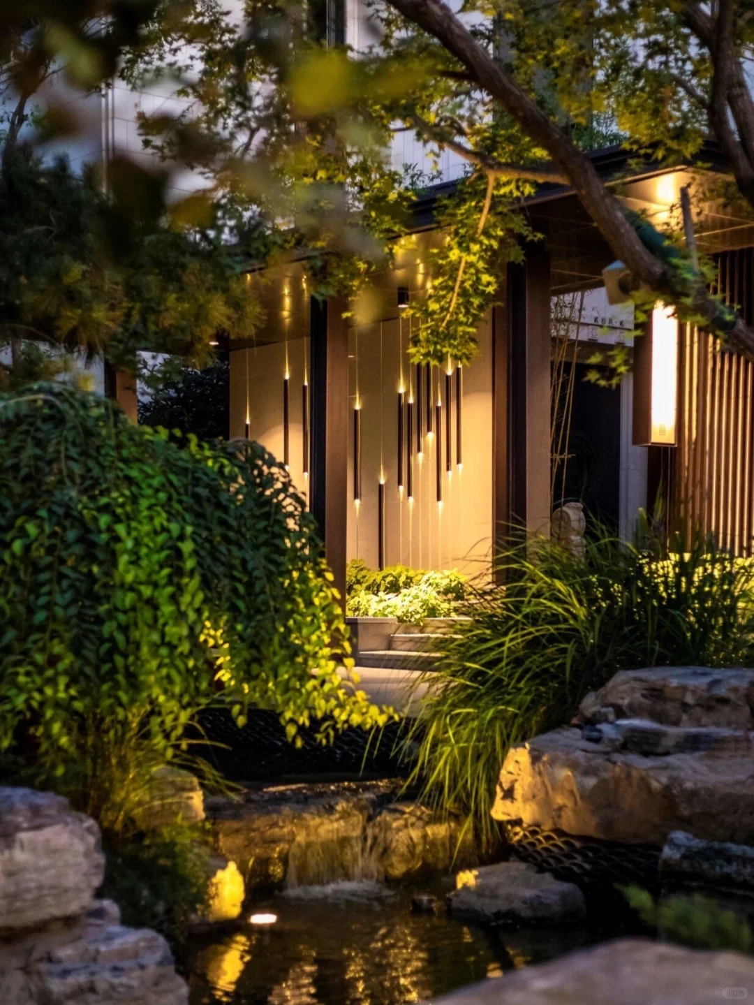 庭院水池的燈光設計可以用流動閃爍的燈光激活它的視覺效果,伴隨著水流聲植入音樂,制造夢幻的空間景象。