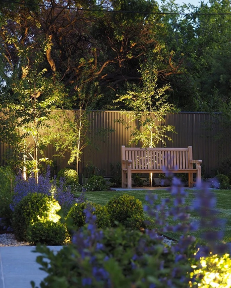 低矮灌木不適合近距離投光照明,容易破壞灌木形體的完整性,所以我們可以使用下照式草坪燈,從上方打光,遠距離投射,保持灌木形體的完整。