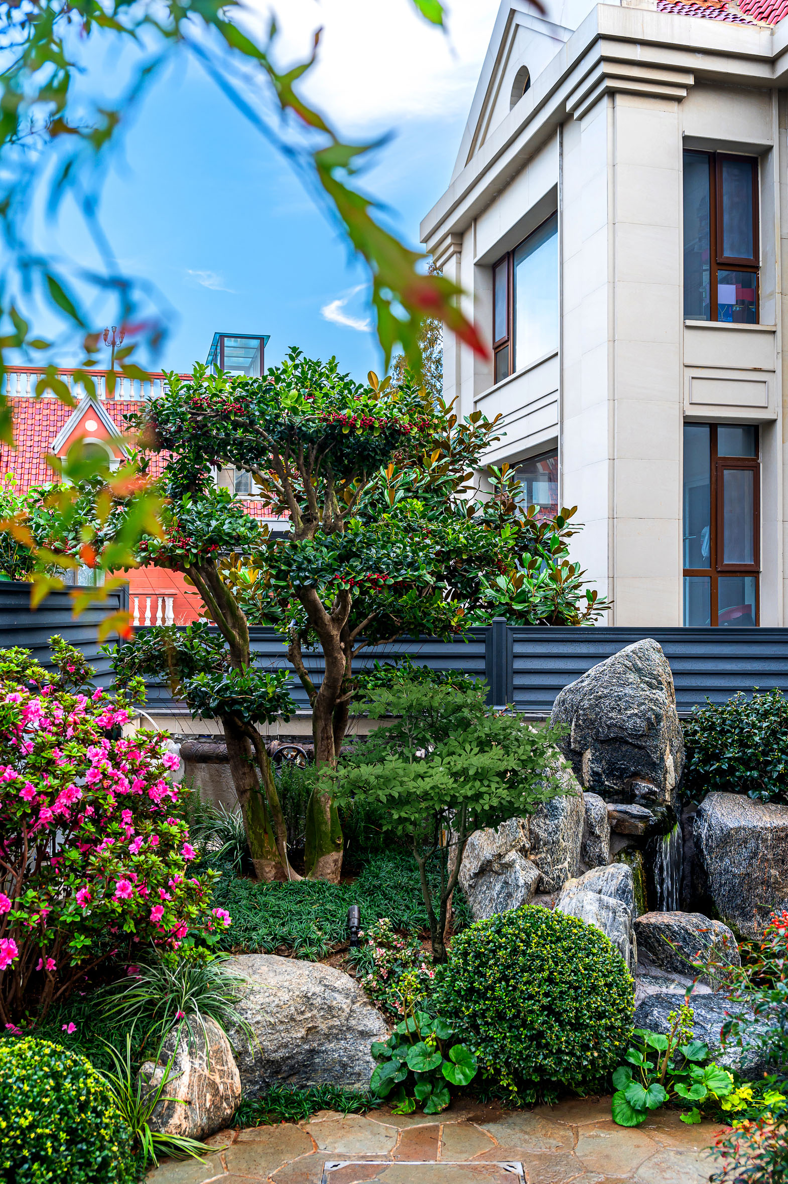 庭前山水相依、流水潺潺,清泉從假山流出,雖是人造的流水,亦如深山的瀑布。溪徑蜿蜒流向茶亭,沿河岸邊設置高低景石和石板橋,搭配楓樹、杜鵑球、玉簪、金葉石菖蒲等植物組景,為業主提供親水活動空間,可坐與岸邊石上觀賞池中錦鯉嬉戲,楓葉低垂,花木倒影,山水意境,讓人流連忘返。