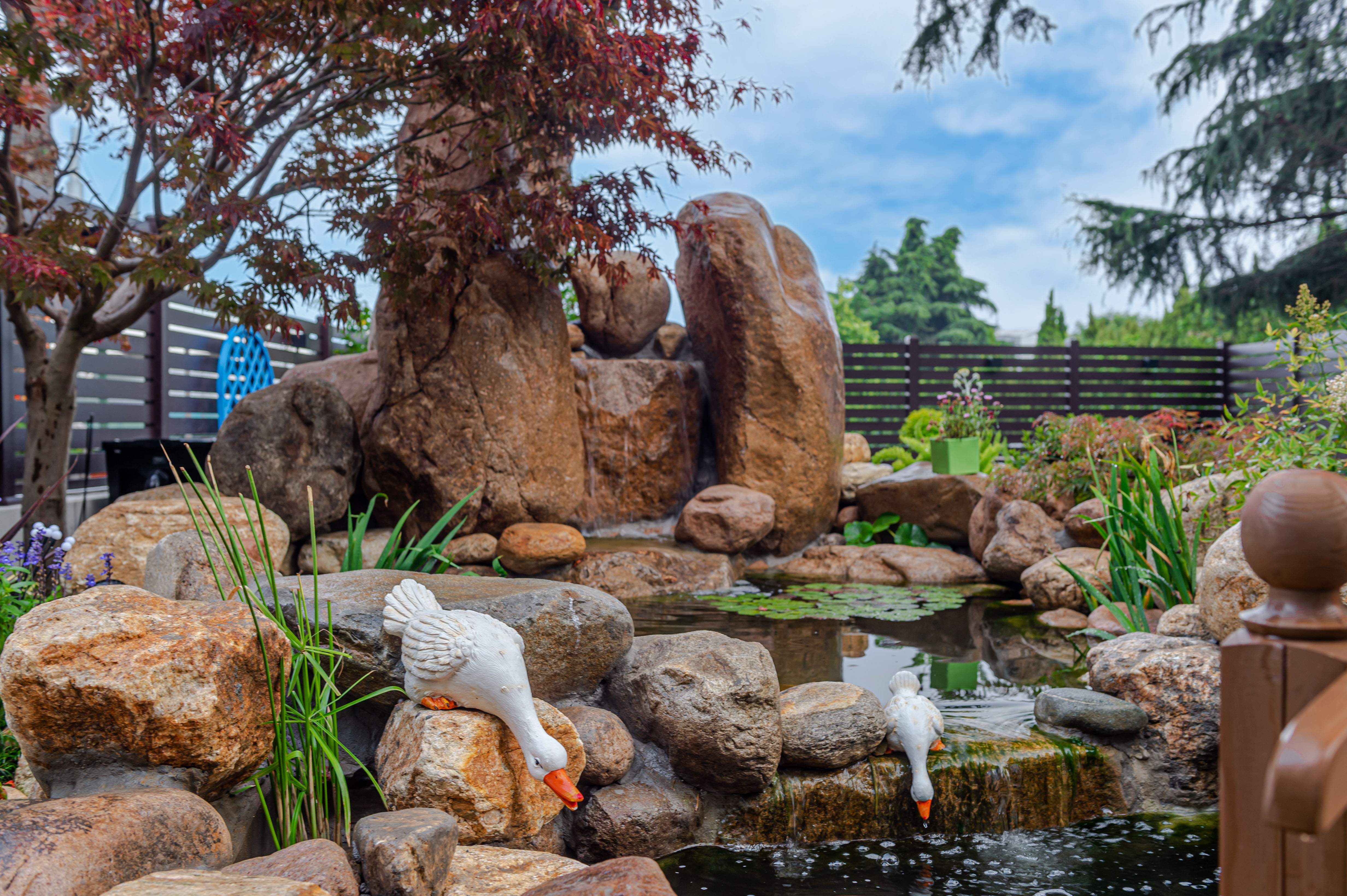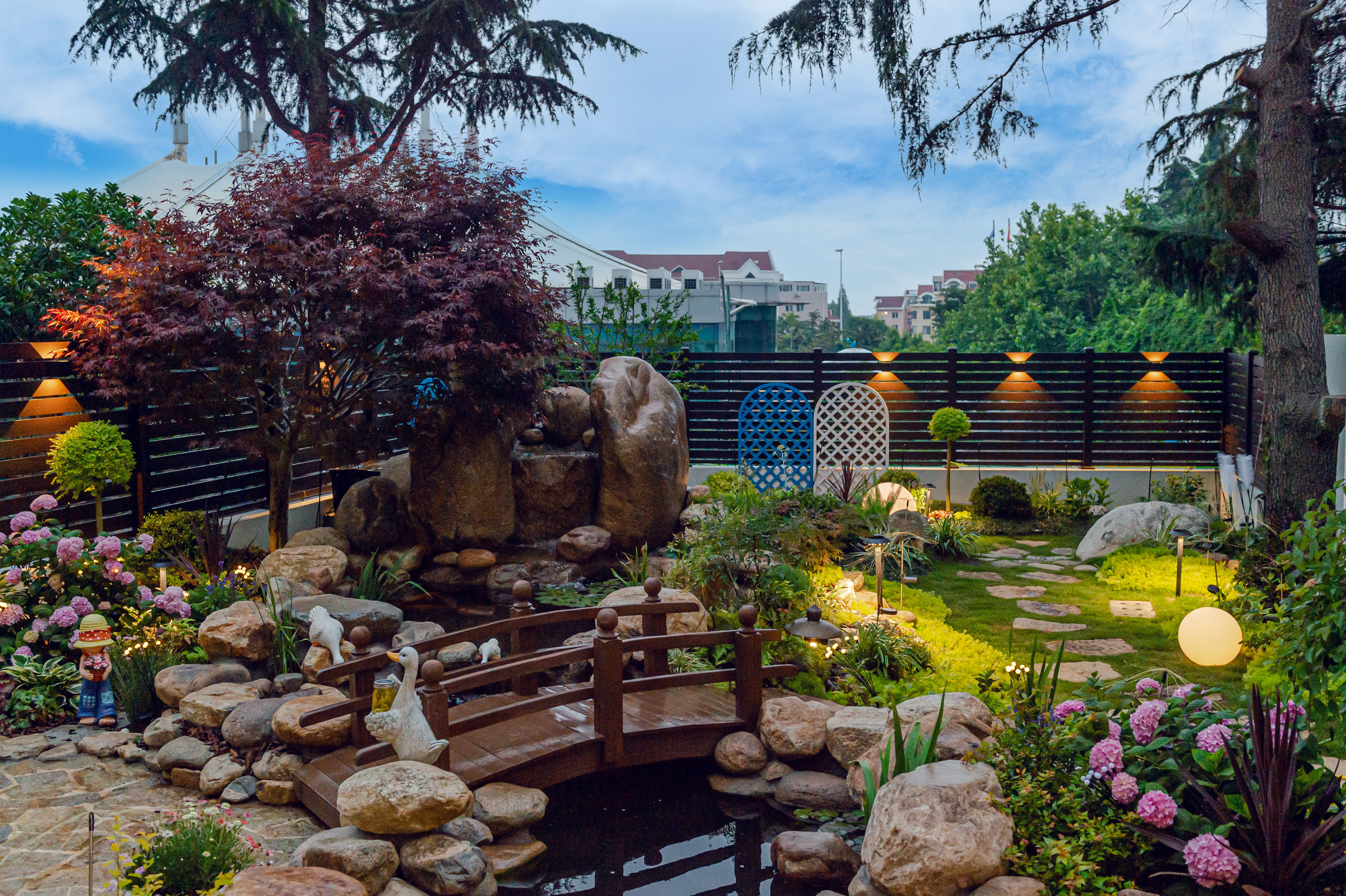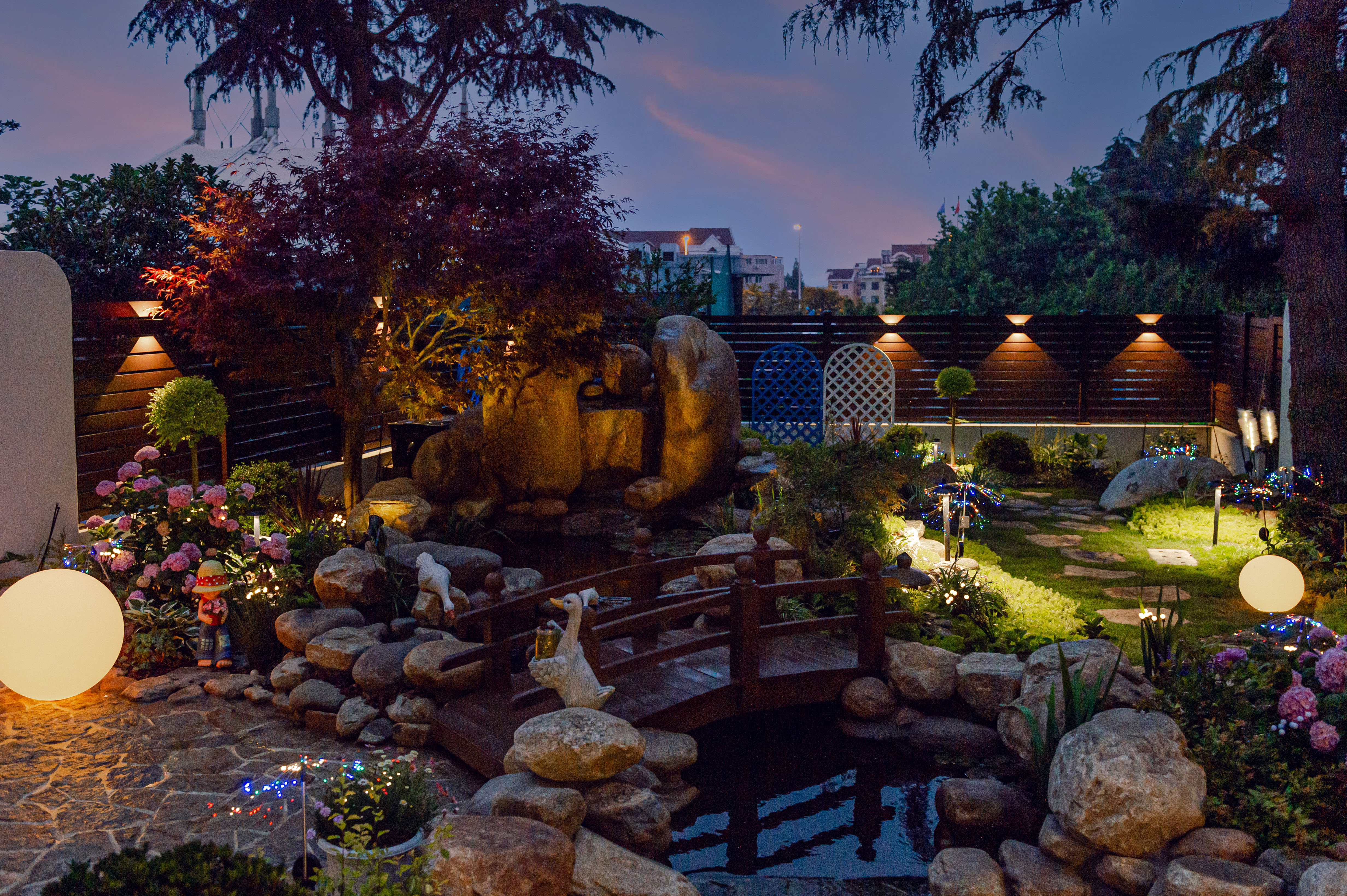 清晨,睜開雙眼,推開窗戶,呼吸著院子的花香,青草味,聽著鳥叫聲,看家中的貓咪與狗狗在草地中快樂地穿梭著。傍晚躺在秋千上看日落和晚霞,感受著院子里溫柔的風。夜晚,花園化身成為神秘的世界,在院子里看繁星點點,沐浴在柔和的燈光中放松身心,在這寧靜的夜里,只聽到潺潺的溪水聲,讓人卸下了一整天的疲憊。