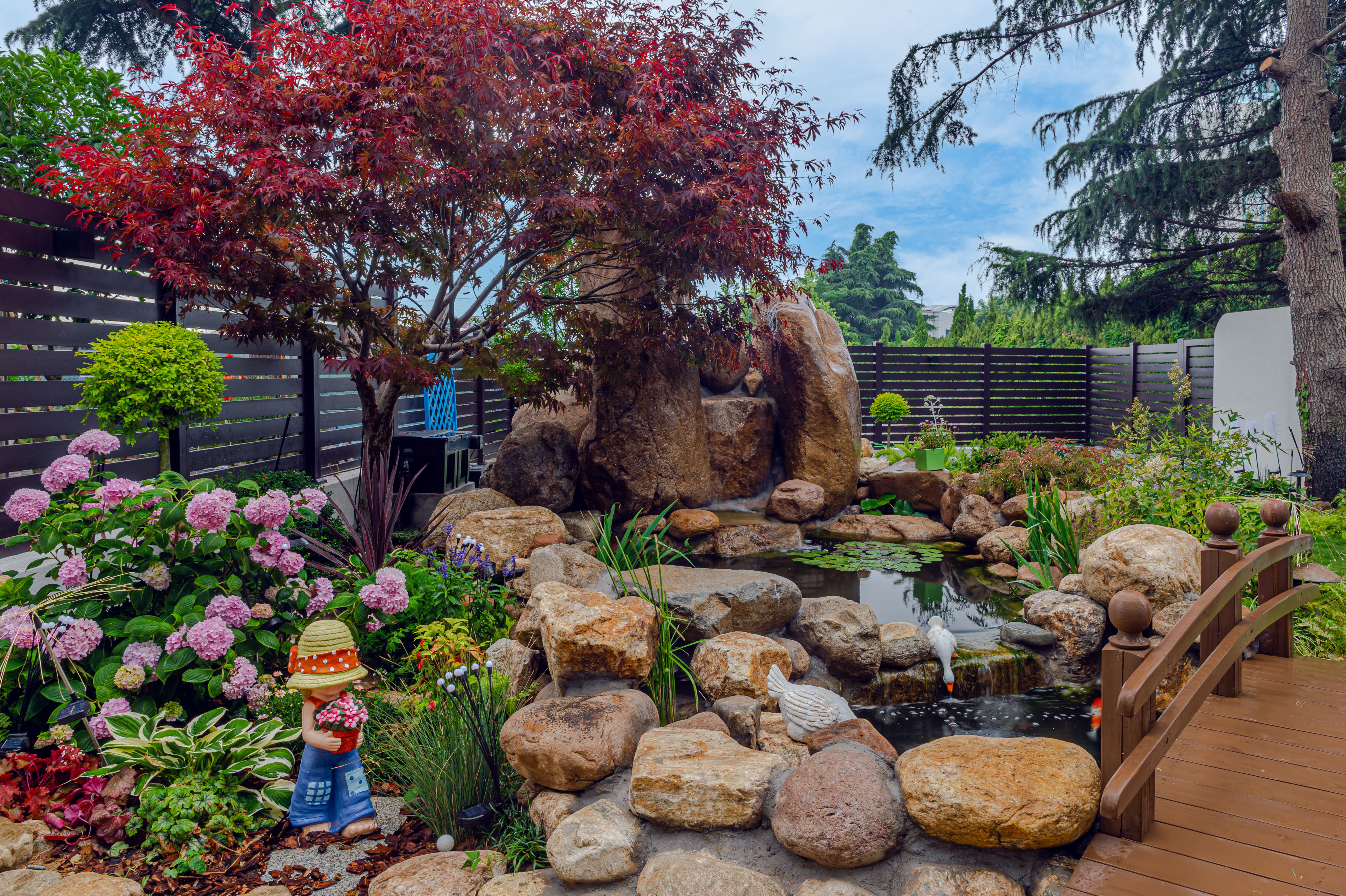 因男業主是理工科專業,不喜歡過于人工化的產品,不喜歡直線,喜歡自然曲線且柔和的布局,所以我們將花園分為三部分: 休閑平臺、錦鯉魚池及后花園。出戶設計成大區域的木塑平臺,在午后慵懶的陽光下,享受自然的清新,感受小院的溫馨。
