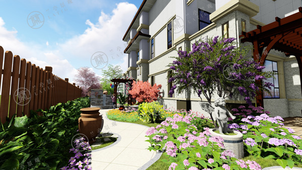 1.整個青島庭院設計分為入口水景、廊下休閑、花徑小路、田園菜地和秋千花園幾大部分。進門處布置樹池,以解決庭院門與建筑門相沖的問題。