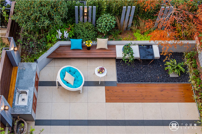 整個花園地面材質注重簡約干凈,跳色鑲嵌芝麻黑讓地面鋪裝更有律動感;同時,臨近水景,材質中融入木制元素,既柔化石材帶給人們的硬朗,又呼應立面的木制景觀,給花園主人良好的花園體驗和獨特的視覺感官。