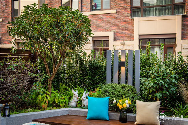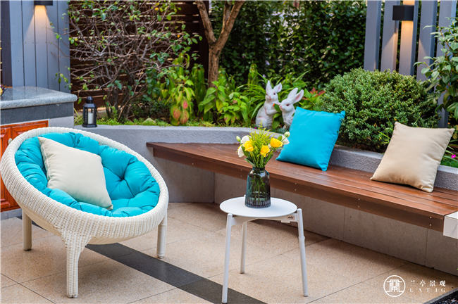 其二,西南角的是全家人的主要活動休閑空間,為了最大化的利用空間,此處的坐凳我們設計成與花壇結合的形式,坐凳背后的花壇種植喬灌木和花卉,使整個休閑區被綠植半包圍,自然的舒適感油然而生。