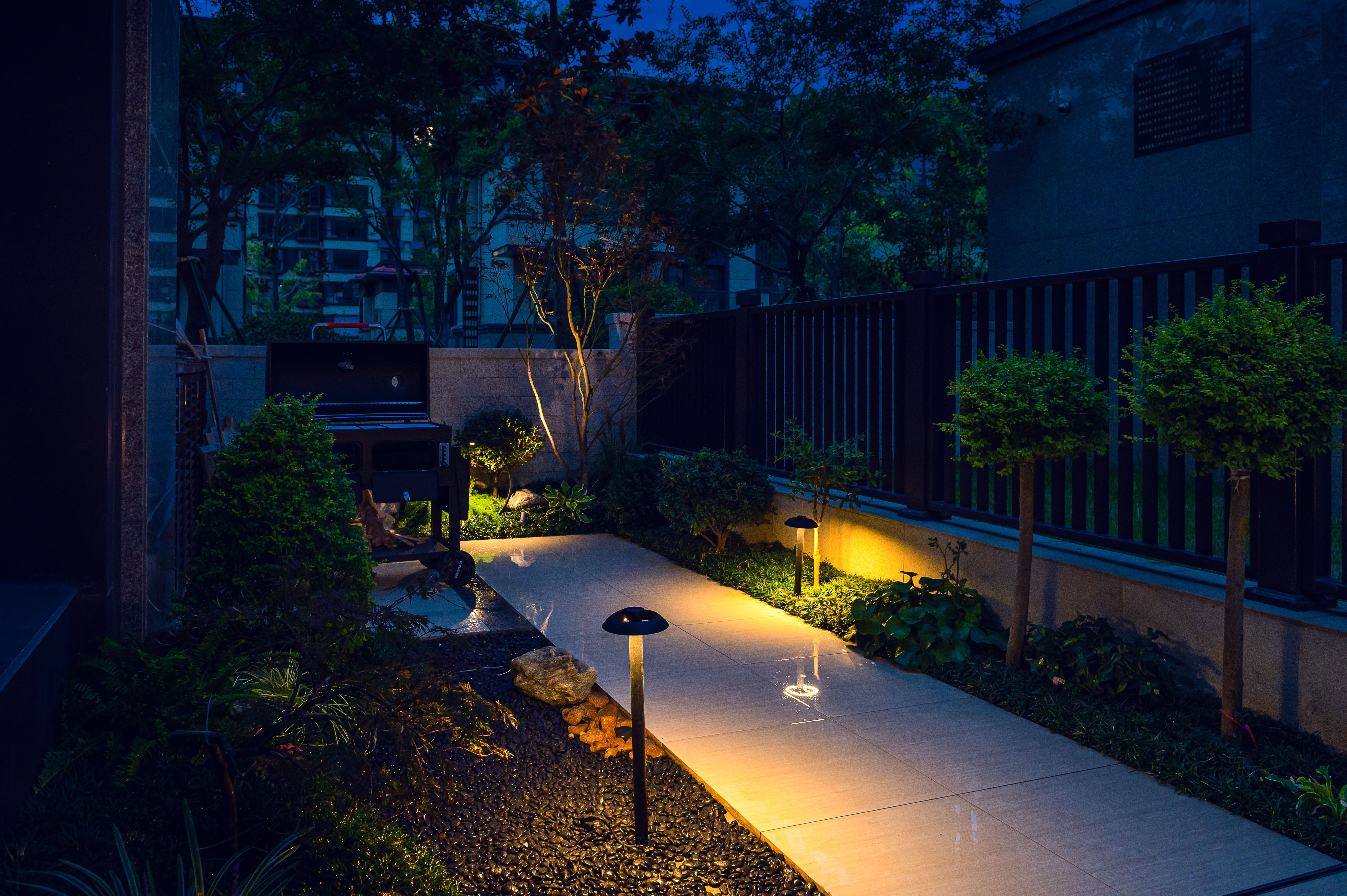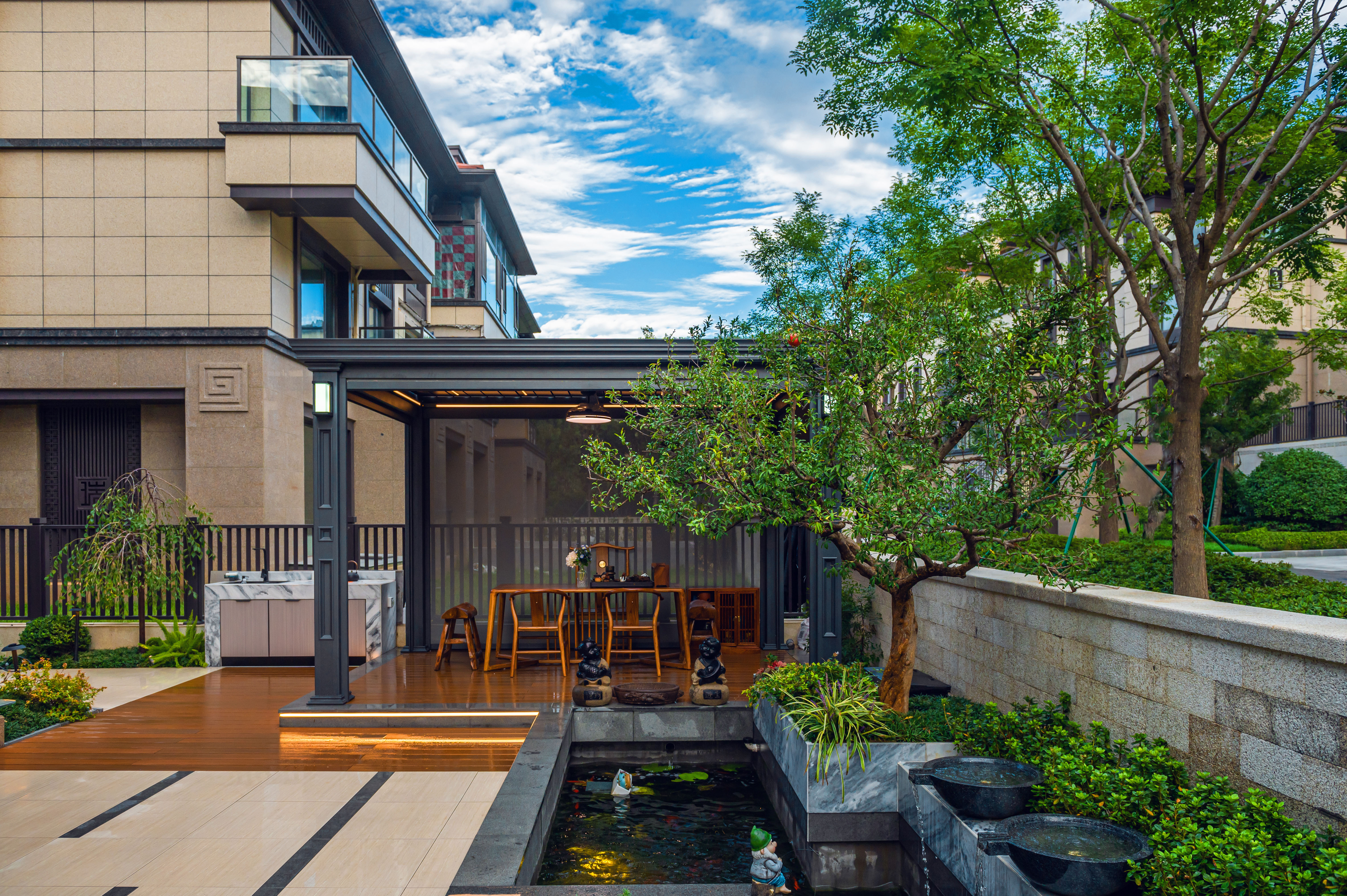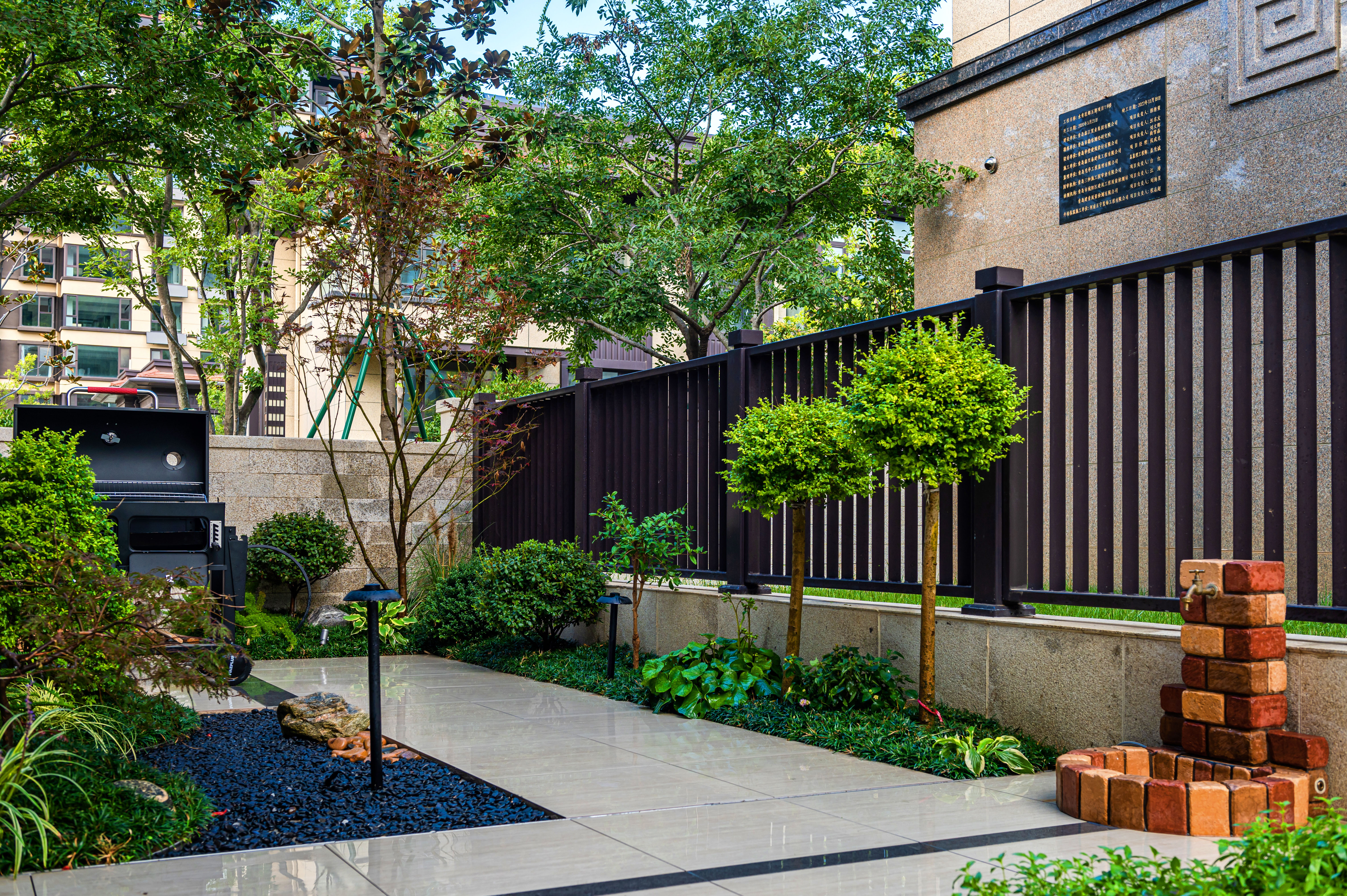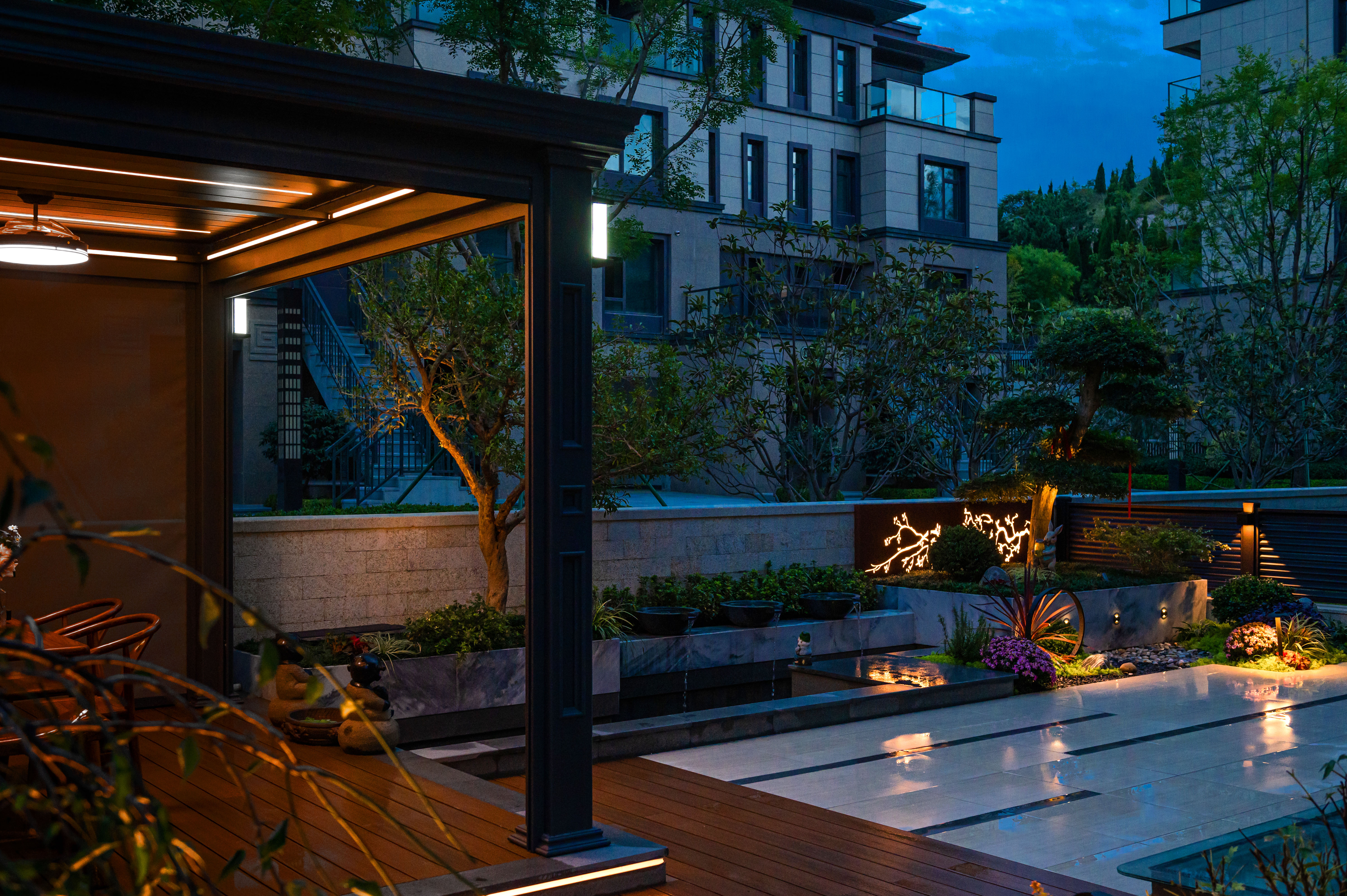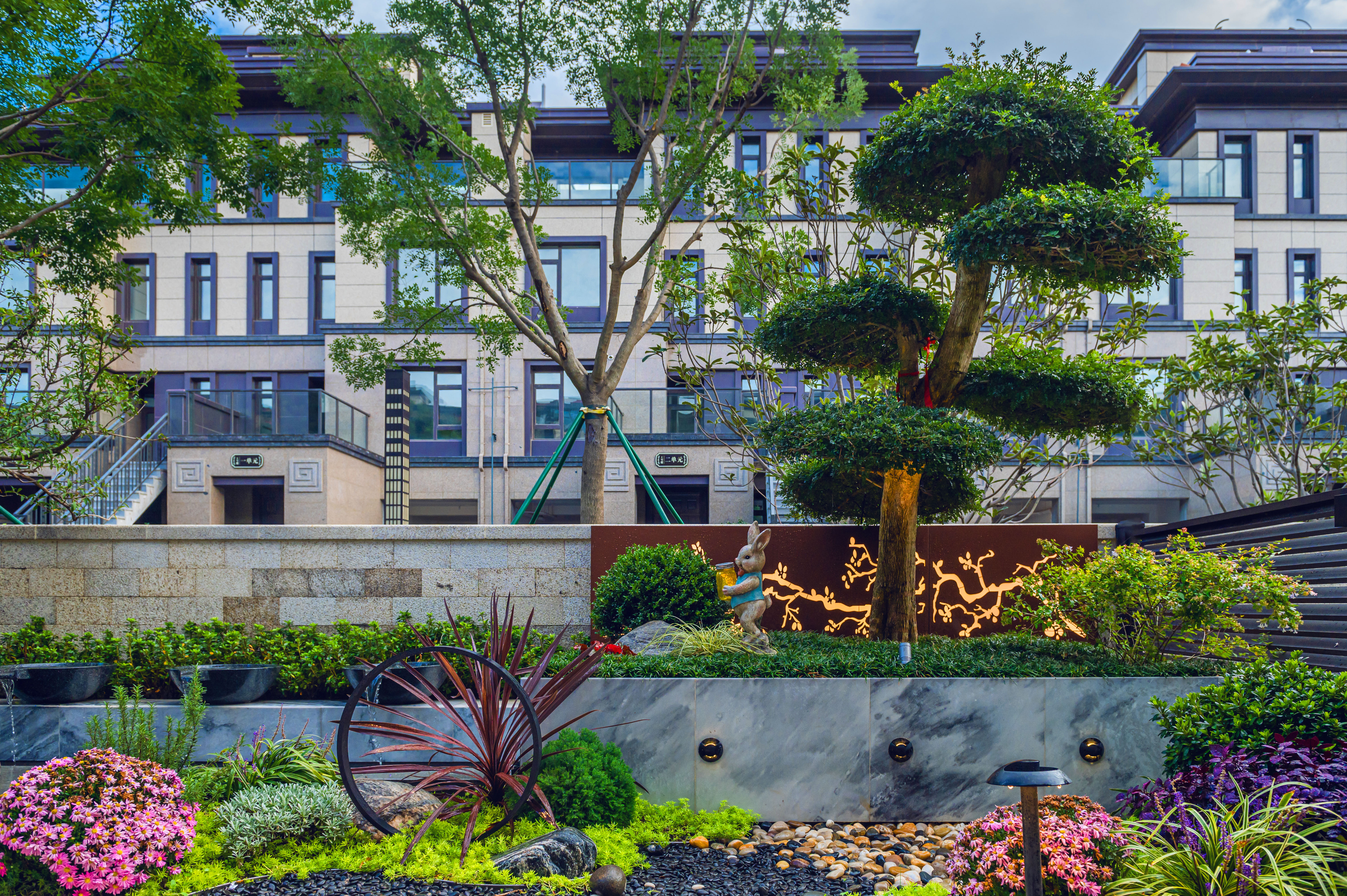 “清風(fēng)明月本無(wú)價(jià),近水遠(yuǎn)山具有情”,該庭院亦是以水景為中心,為空間營(yíng)造更多的活力及趣味。處理空間方面強(qiáng)調(diào)整體空間的寬敞、通透,盡可能不用裝飾和取消多余的東西,沒有實(shí)用價(jià)值的構(gòu)筑物及裝飾都會(huì)增加局促感,對(duì)于小而精的庭院,相對(duì)于強(qiáng)調(diào)形式應(yīng)該更多的服務(wù)于功能。豎向設(shè)計(jì)上,會(huì)客區(qū)的智能化涼亭在加上高低錯(cuò)落的樹池、流水石砵、起伏的綠植地形,營(yíng)造出清新雅致且層次豐富的空間體驗(yàn)感。
