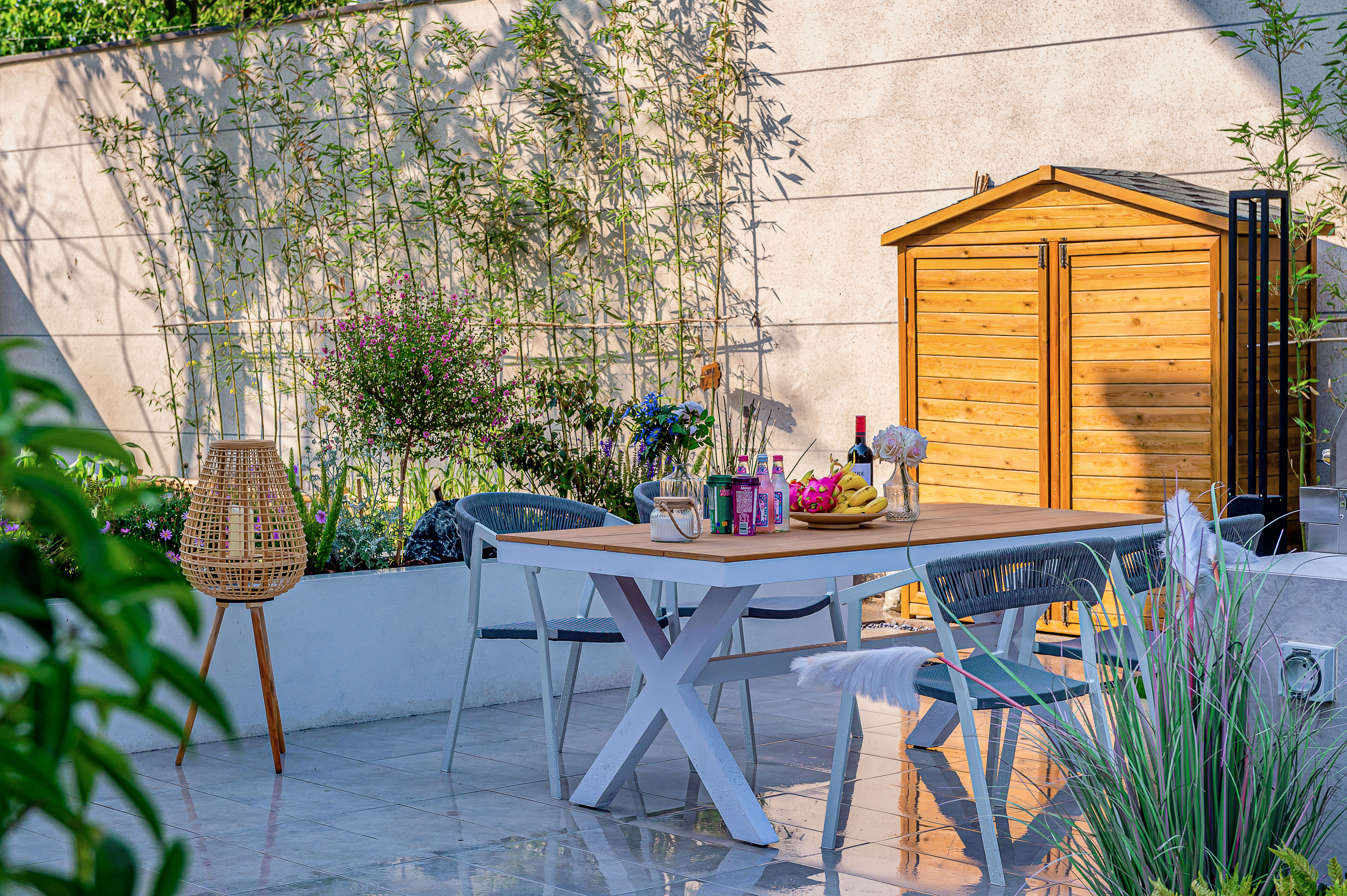 花園轉(zhuǎn)角后,映入眼簾的是一個(gè)寬敞的空間,這個(gè)花園的東部空間是根據(jù)主人的喜好和需求進(jìn)行的個(gè)性化設(shè)計(jì),燒烤區(qū)與四塊菜地結(jié)合在一起。女主人比較熱愛種植,另外也為了用這個(gè)種植區(qū)對家里的孩子進(jìn)行啟蒙教育。菜地與燒烤區(qū)不是無縫連接在一起的,中間有一個(gè)60厘米的小花池,一方面是起到過渡遞進(jìn)的作用,另一方面是為了避免在燒烤區(qū)休閑時(shí)直接看到菜地里的農(nóng)作物。這個(gè)區(qū)域還設(shè)置了一個(gè)儲(chǔ)物柜,以便于存放農(nóng)作工具和水車等。