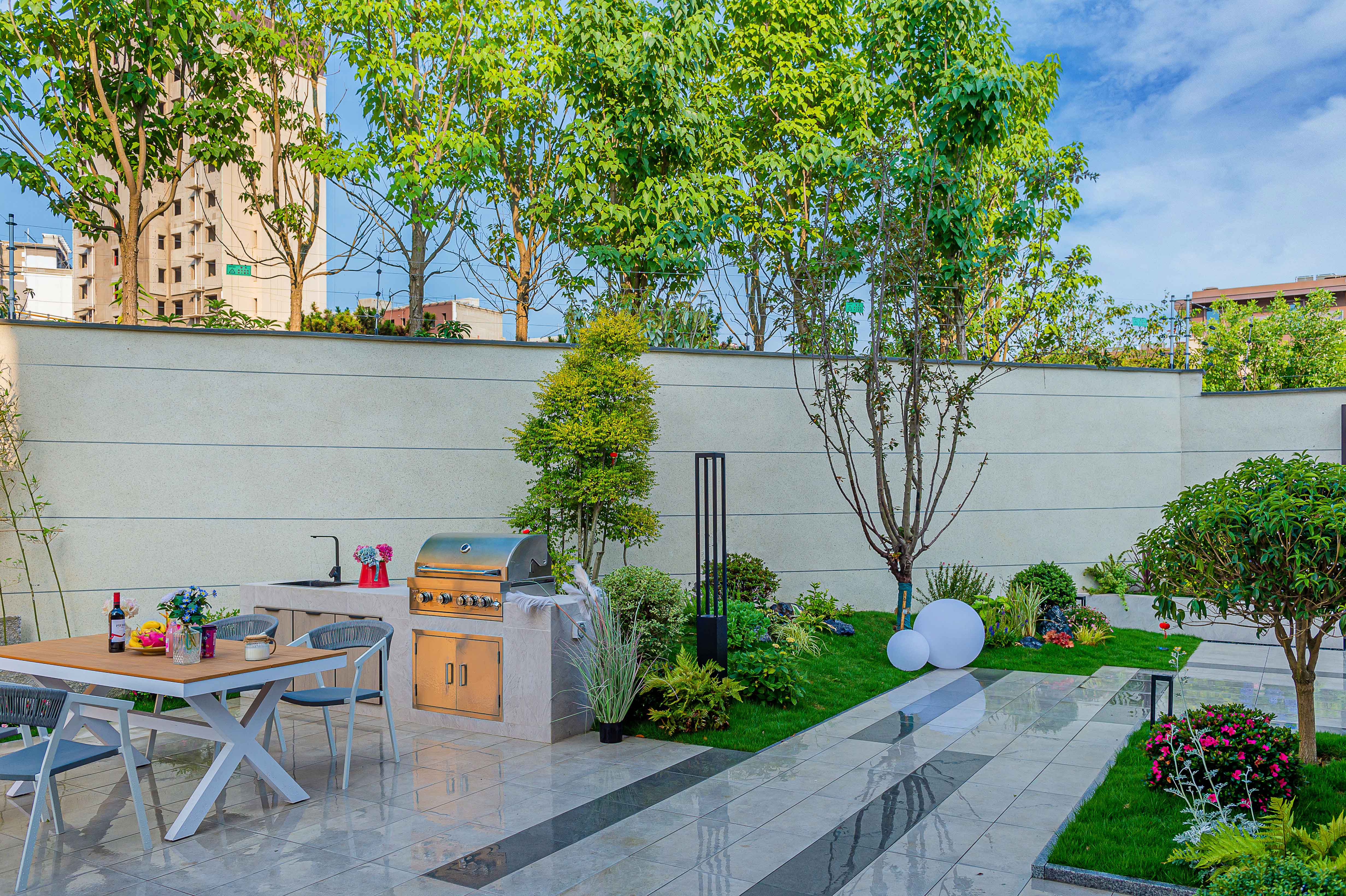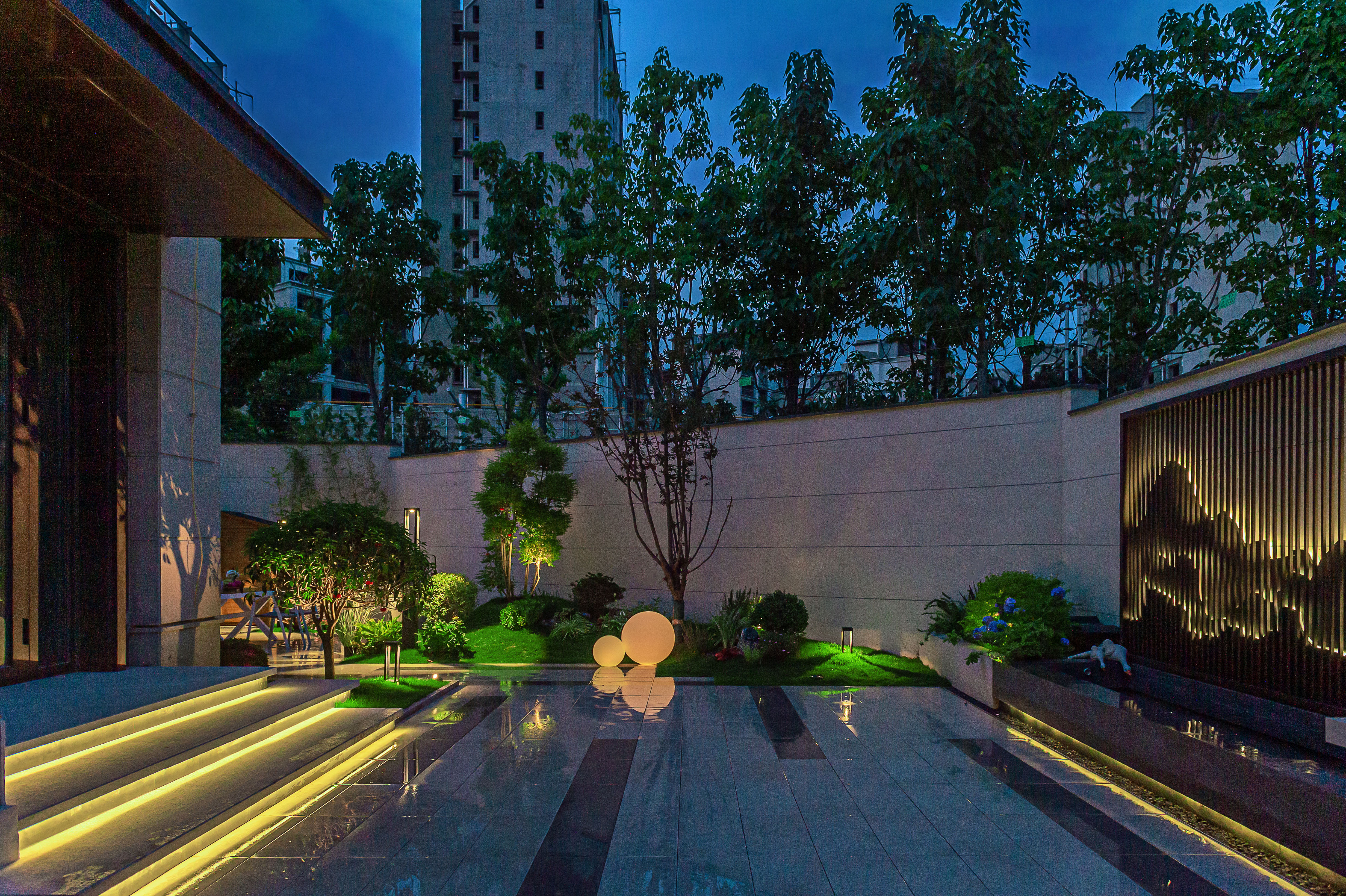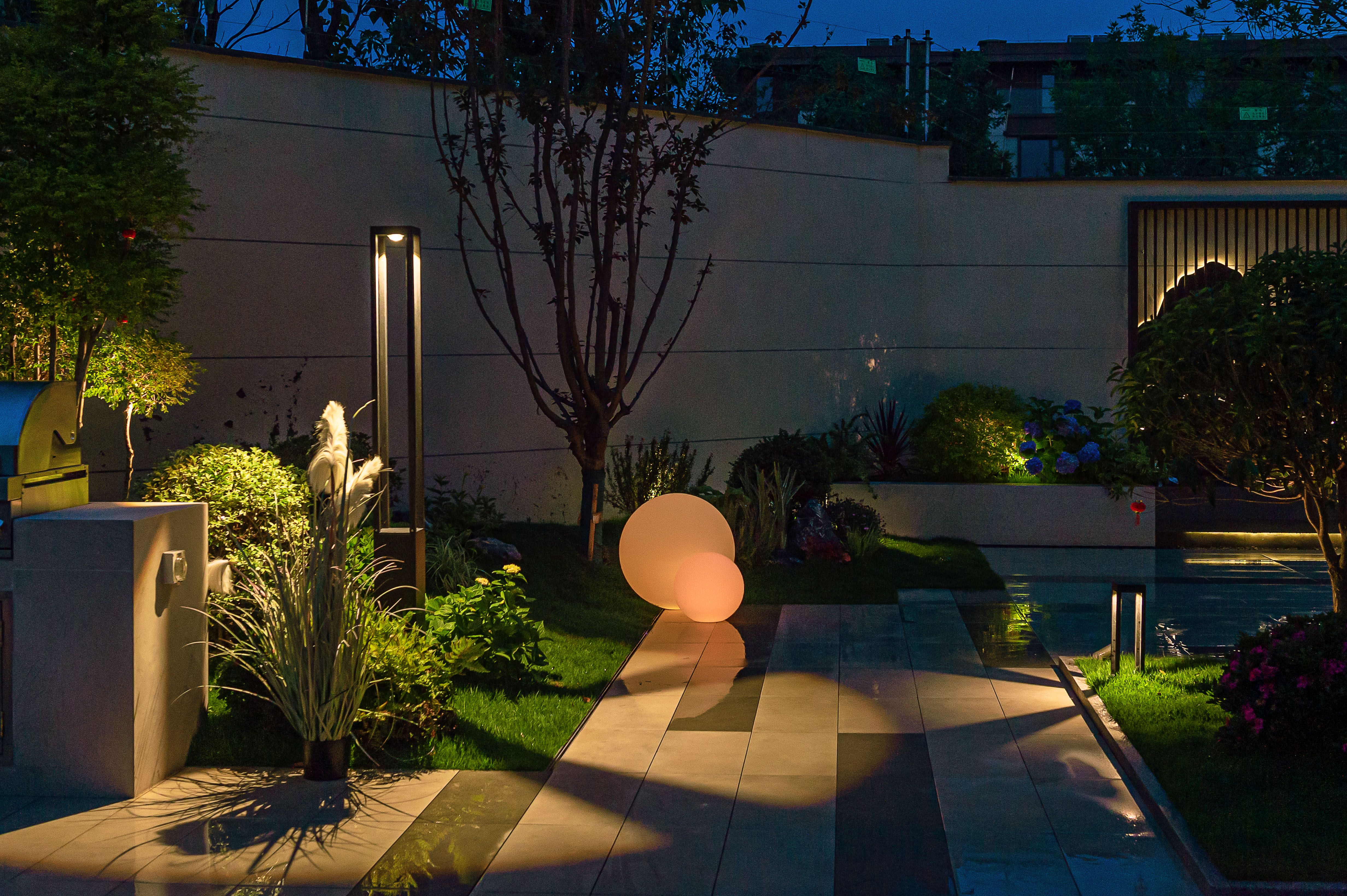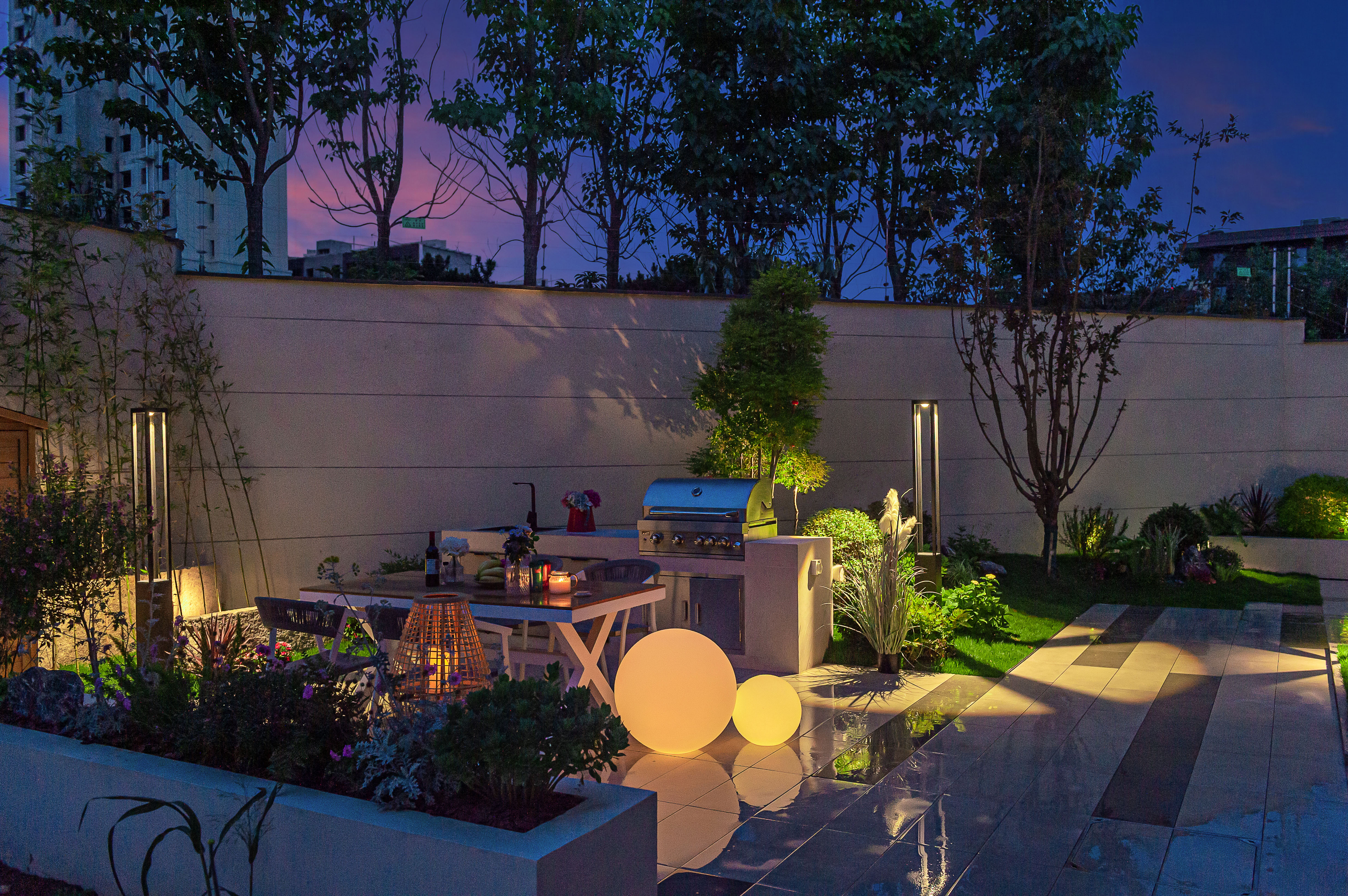 此外,花園的照明也進(jìn)行了精心的設(shè)計(jì),草坪燈、壁燈、射樹燈等安裝在不同的區(qū)域,營造了不同的氛圍。在夜晚,燈光使花園更加浪漫和宜人