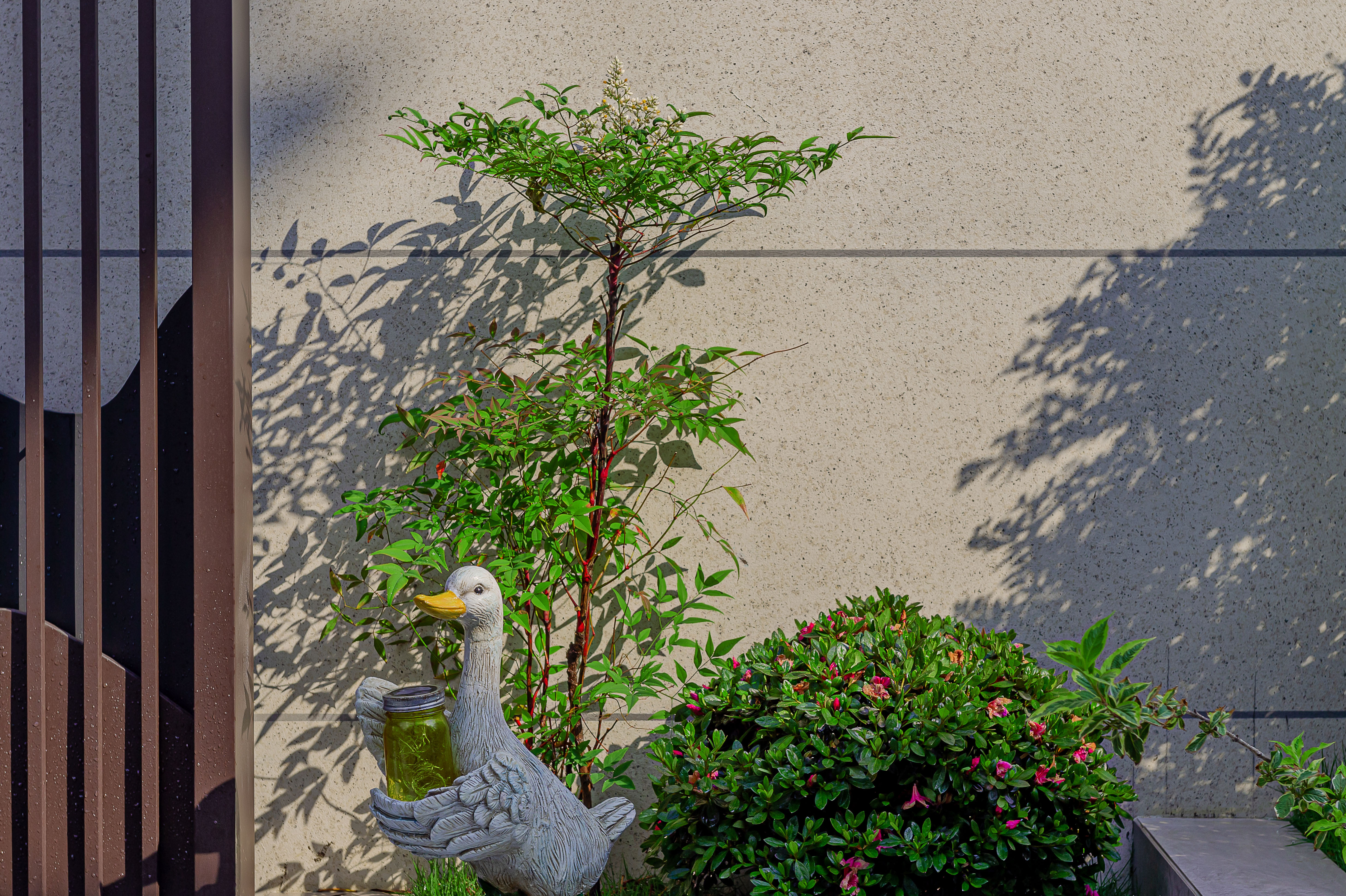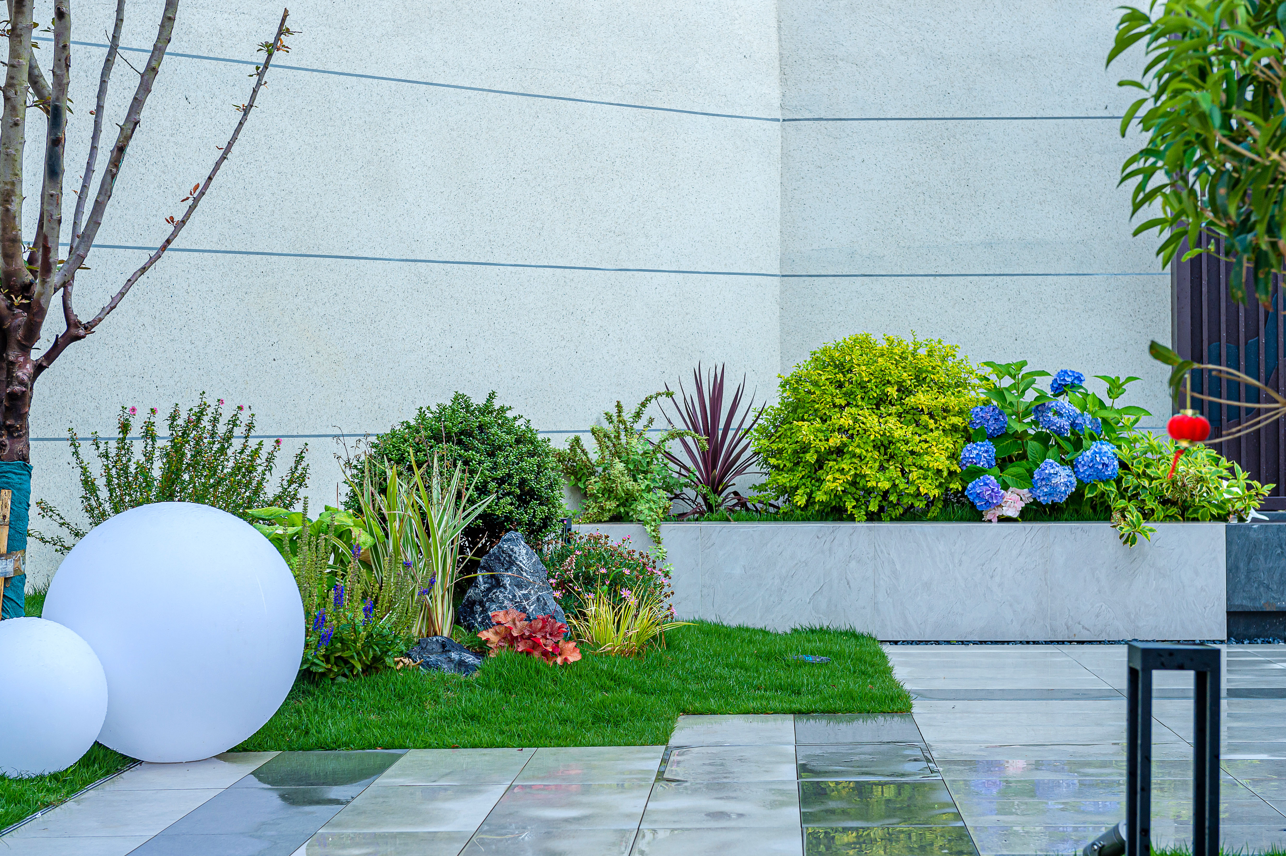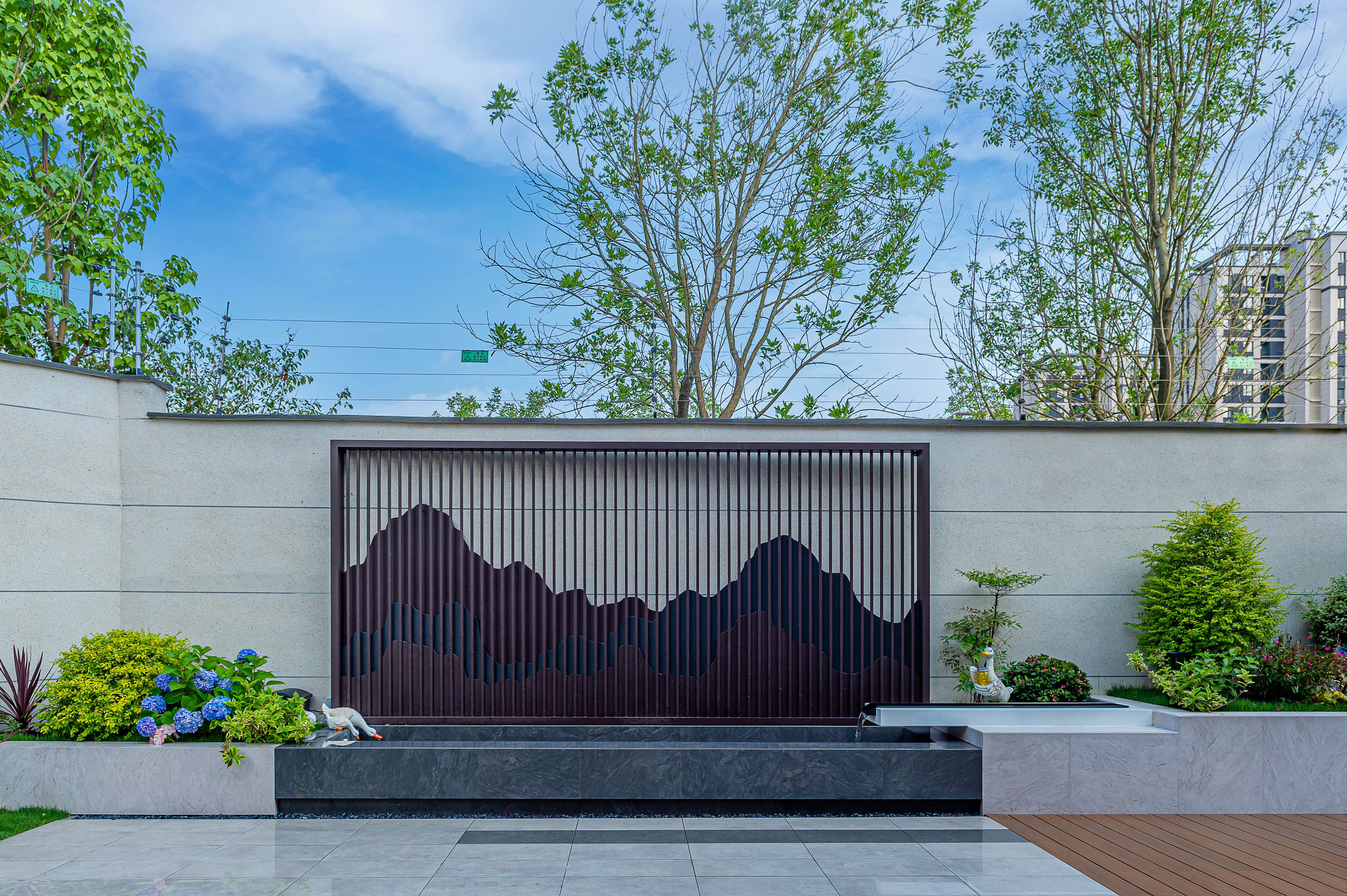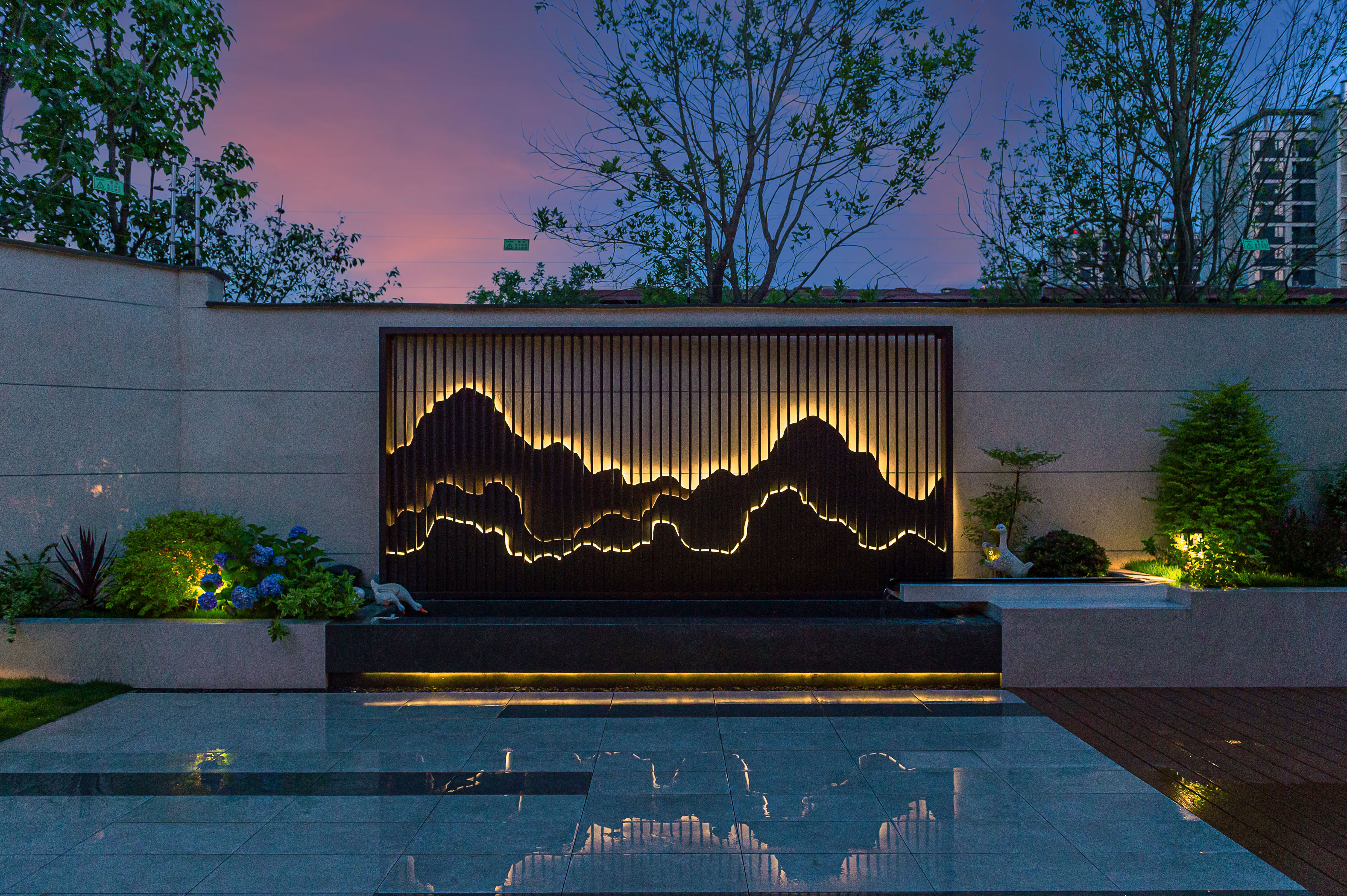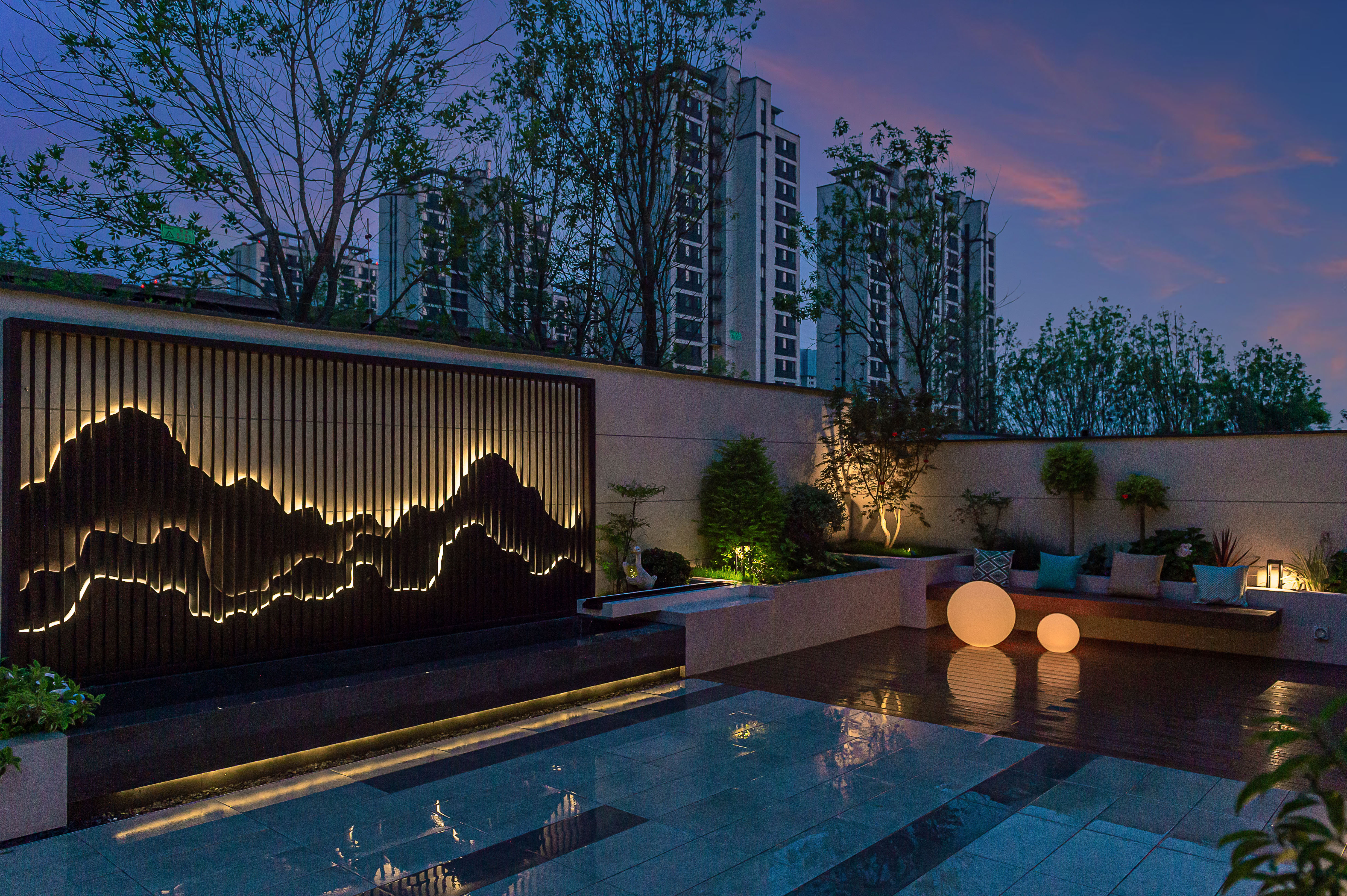 在院子的南面區(qū)域,客廳的對面,設(shè)計(jì)了一個(gè)現(xiàn)代風(fēng)格的金屬背景發(fā)光板以及小的跌水景觀,雖然水系面積不大,但也足夠養(yǎng)殖一些小的觀賞魚,再加上水流的潺潺聲,讓整個(gè)院子更加靈動(dòng)。