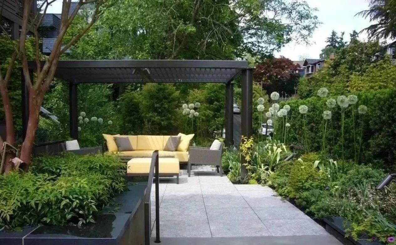 如果院子面積夠大,可以在院子外圍種植高大的常綠植物形成綠化阻擋視線,院內(nèi)則隨意布置,利用植物的高低落差打造成不同的景觀。