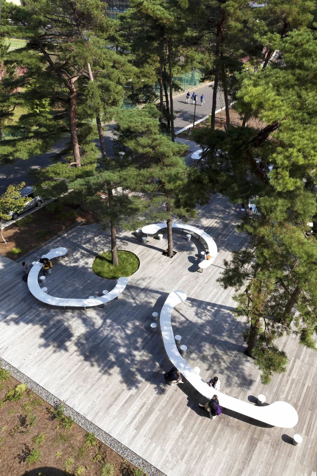 作為整個花園最重要元素的樹桌,看似自由隨機的外型,實際上也是分析推導出的:規模按照一個40人班級的課桌尺度演變而來;定位依照樹干點位環繞放置;間距與空隙則與周邊建筑接口與通道對接。