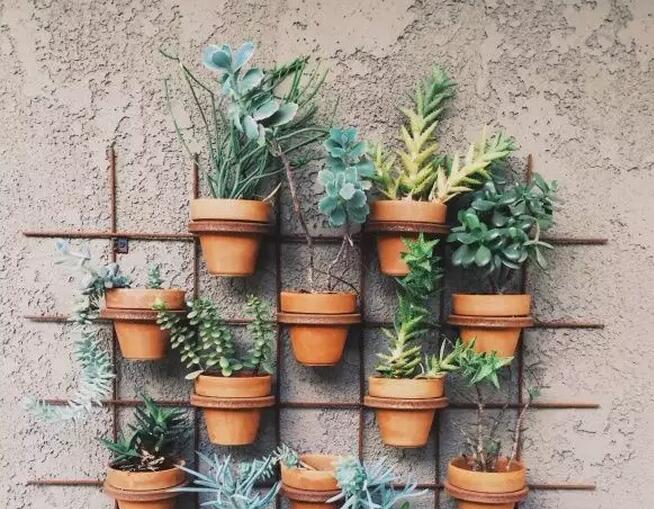 將盆栽逐個地掛在格子上