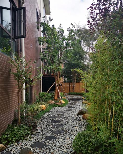 本案花園坐北朝南,門在東側(cè),花園外圍不規(guī)則,設計風格定位上很難把握,通過和園主的洽談,現(xiàn)場的測量,最終定位于日式別墅庭院景觀設計。采用竹子、碳化木制作圍欄,使用傳統(tǒng)的木質(zhì)大門,搭配青磚鋪地和散落的石子,給人一種峰回路轉(zhuǎn),無窮無盡的感覺。在平面構(gòu)圖上采用不對稱的設計,道路‘水岸、地形以自然蜿蜒的曲線構(gòu)圖。